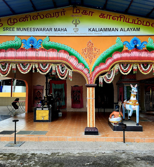 The Maha Kaliyamman Sri Muneeswarar Temple was established in the 1960s in Bentong, Pahang. According to the dream of a Tamil individual residing in this area, Muneeswaran conveyed his desire to have a temple built for him. In response, the devotee cleared a small space nearby, constructed a modest shrine, and installed a trident (Soolam) to initiate the worship of Muneeswaran. Continuing this effort, the People in the vicinity further adorned a statue of Lord Vinayagar in a nearby tree and began worshipping both Muneeswaran and Vinayagar.In the course of time, they extended their devotion by building a small temple for Kaliyamman as well. In 2019, the temple underwent complete renovation and was consecrated with the name Sri Kaliyamman Sri Muneeswarar Temple. Currently, the temple is registered, and all worship ceremonies and festivals are celebrated with great reverence.